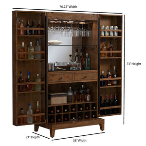 The American Heritage Bristol Wine Cabinet combines rugged charm with thoughtful design. It is built with knotty pine and finished in a warm Harvest tone. The cabinet features a black glass work surface for mixing and prep. It opens wide and gives you both display and hidden storage in one elegant piece. The lighting inside turns off automatically when the doors close, carving out a cozy, ambient mood. The Bristol wine cabinet is ideal when you want a striking wine and bar piece that also functions well for entertaining.