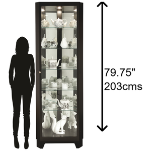 • Veneers and a Black Satin finish further enhance this glass display cabinet, which has glass mirrored panels and angled sides for contemporary elegance.