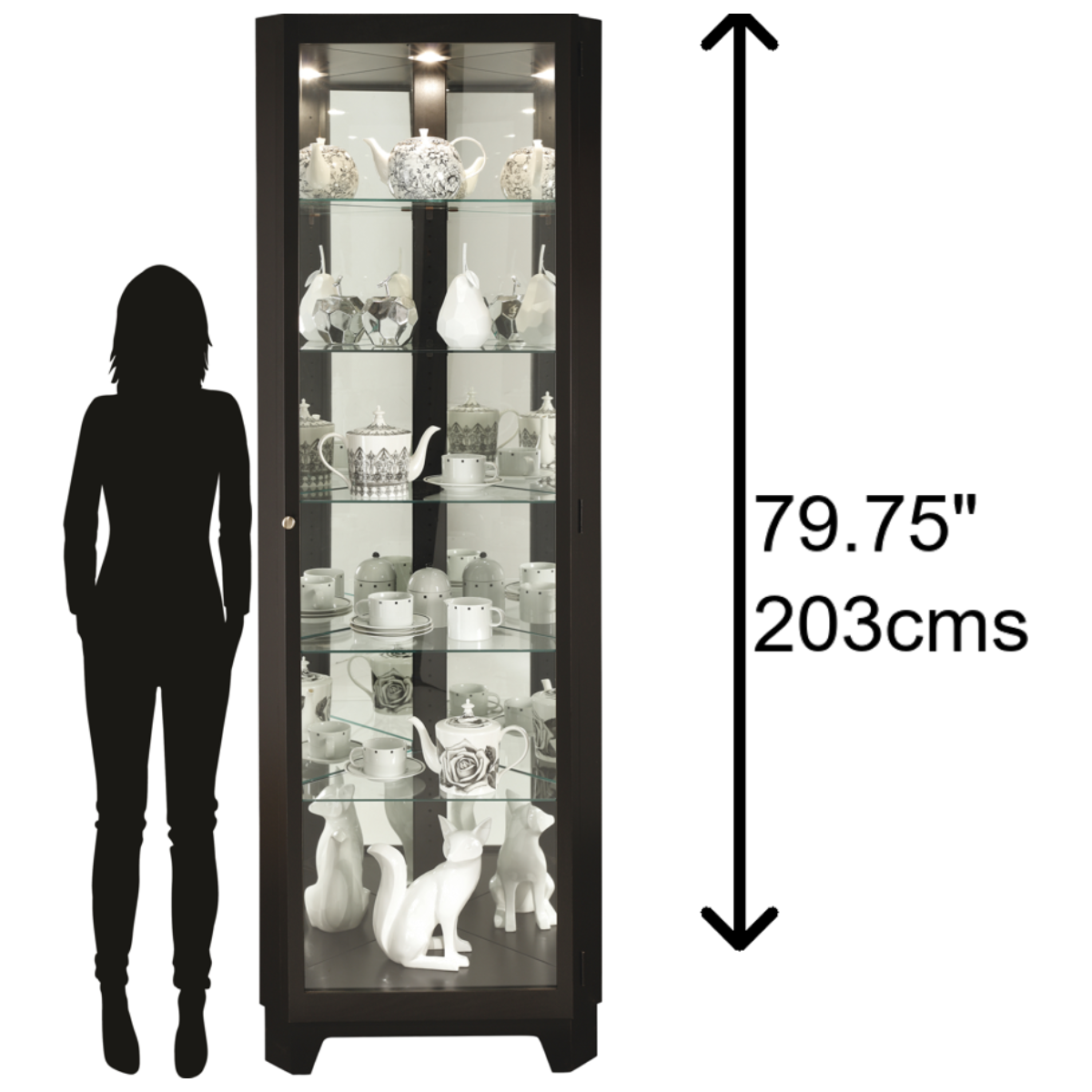 • The five adjustable glass shelves inside this corner curio cabinet offer six display levels.
