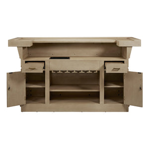 The American Heritage Port Royal Home Bar in White Oak is designed for people who want a bar that feels stylish, fresh, and practical. Its white wash oak wood grain finish makes it look clean and modern. The satin brass hardware adds a stylish contrast. The size is large enough to store what you need yet sculpted so it doesn’t feel bulky.